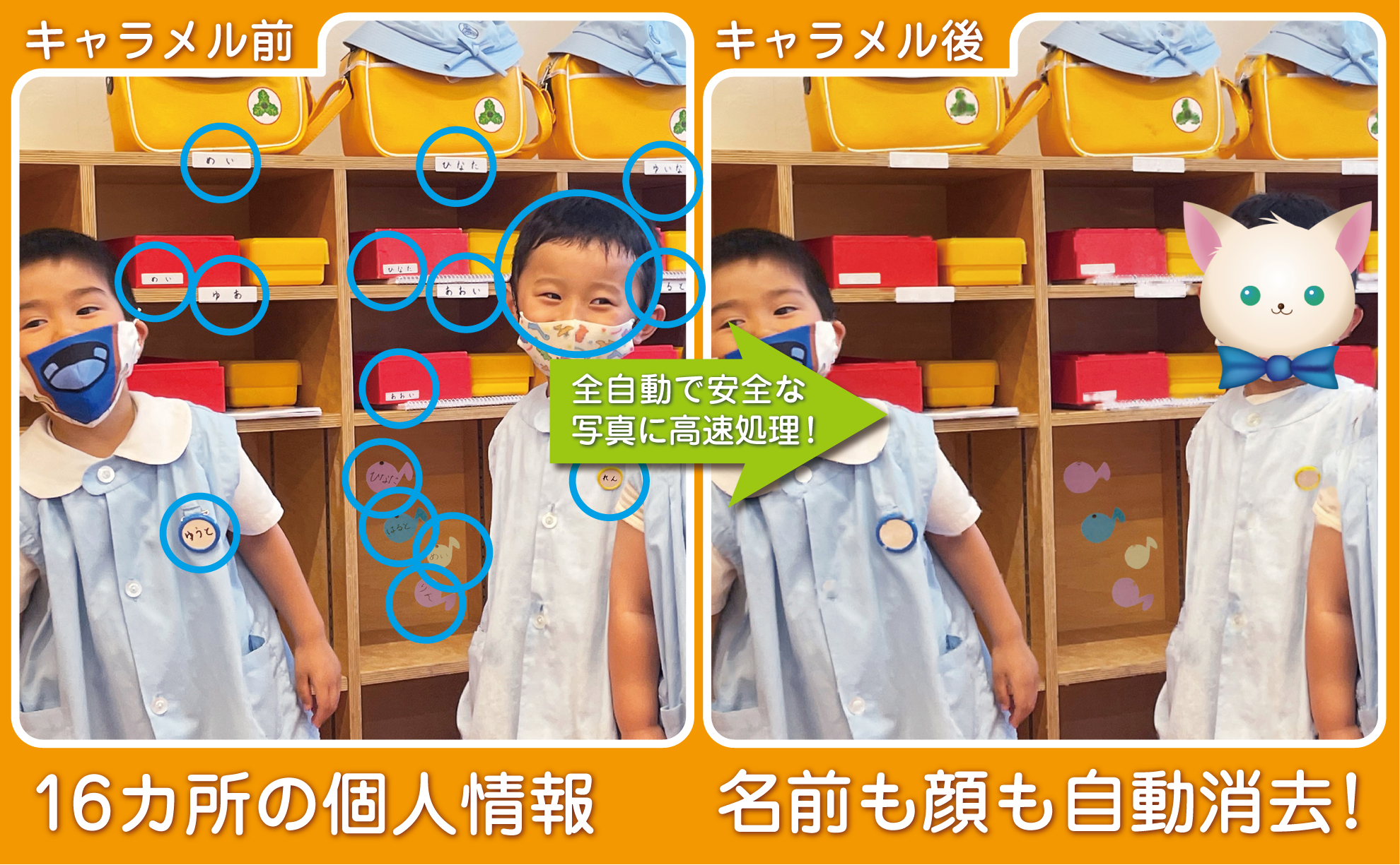ほとんどの保育士さんは写真を1枚1枚チェックし、文字や顔を手動作業で消去しています。『キャラメル』は、この大変な作業から保育士さんを開放します。
